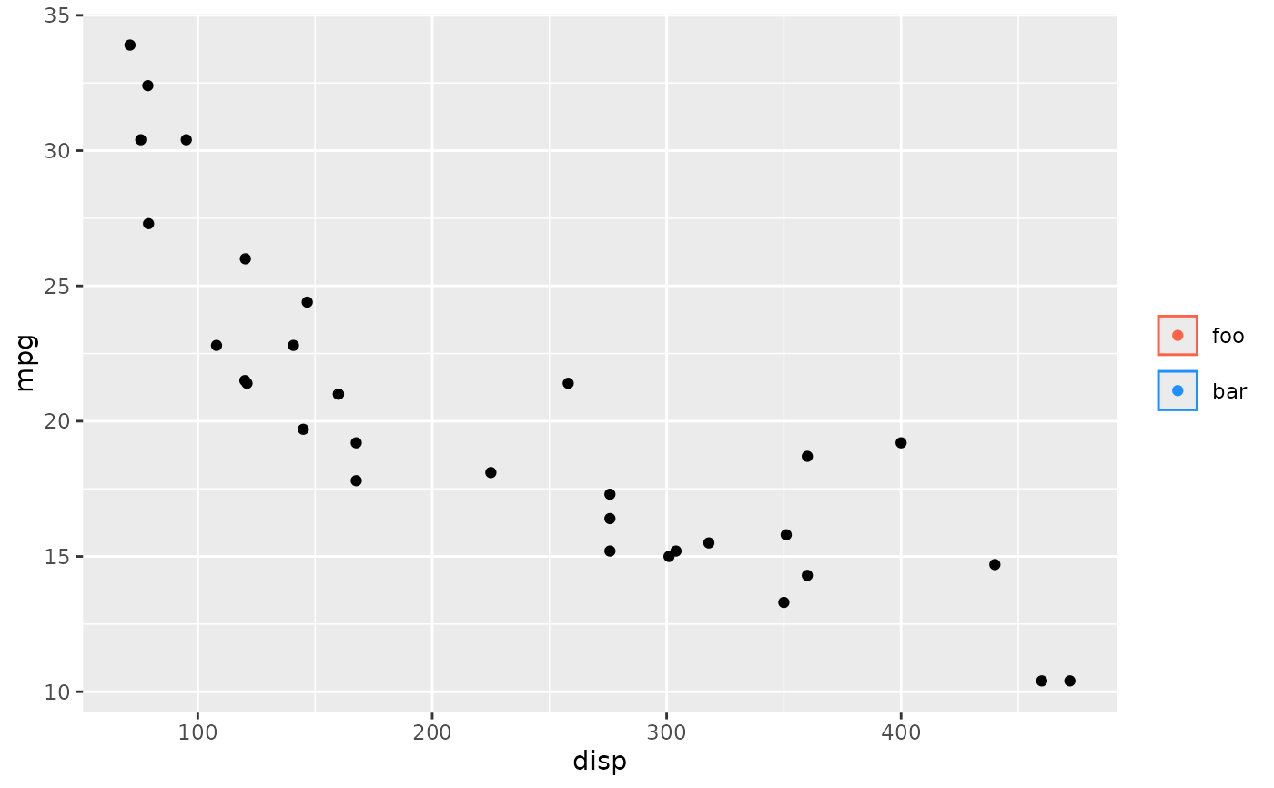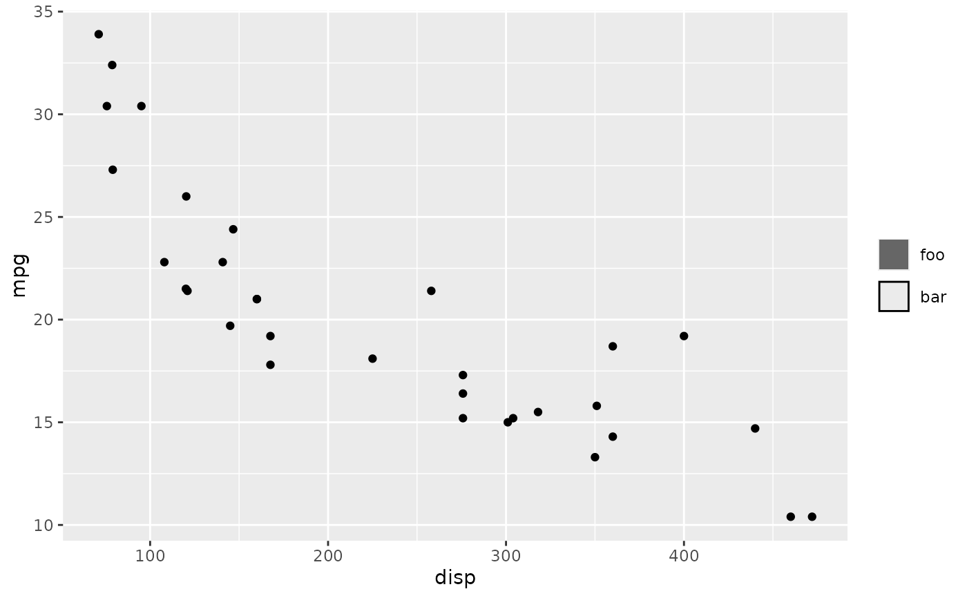 p <- ggplot(mtcars, aes(disp, mpg)) +